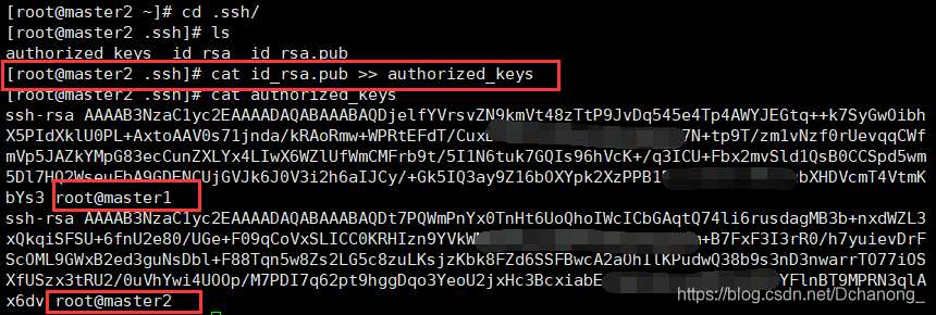 [root@master2 .ssh]# cat id_rsa.pub >> authorized_keysmaster2 的公钥就保存在 authorized_keys 文件中了